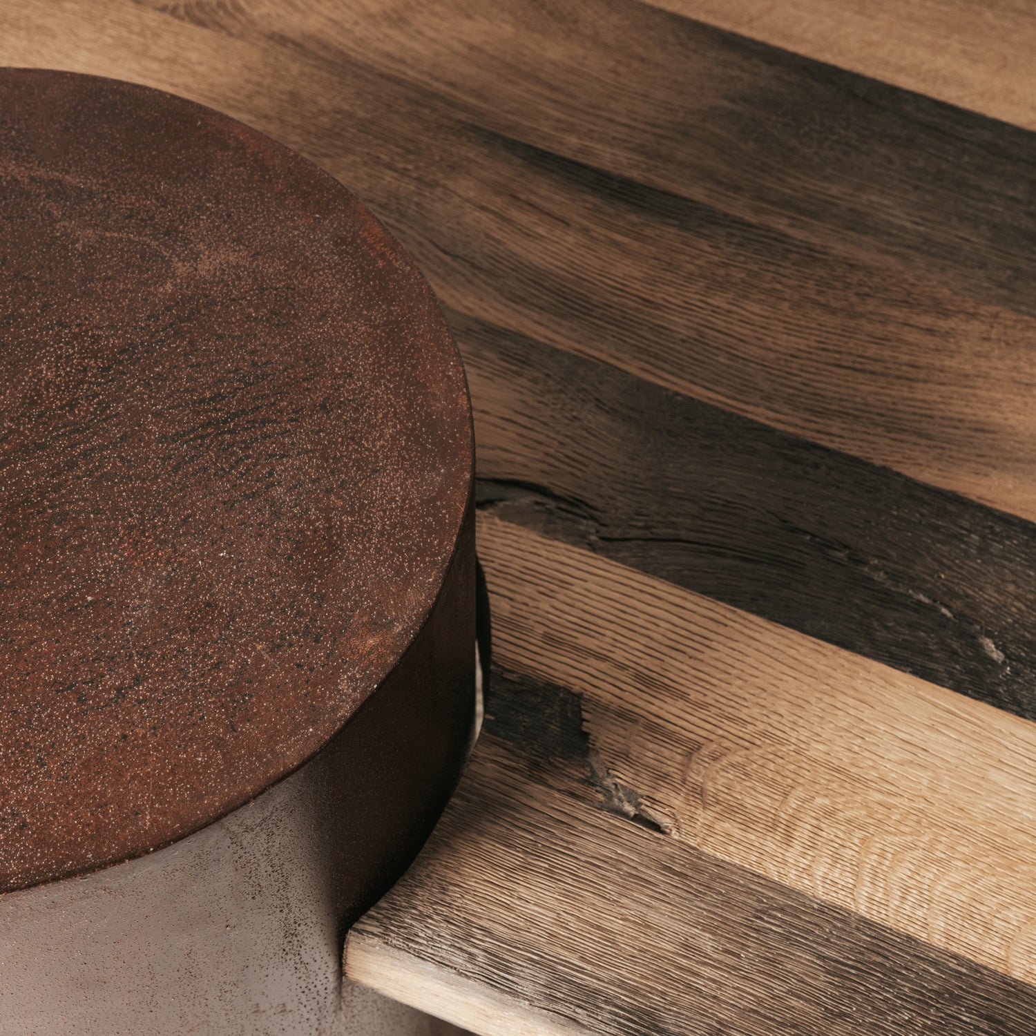 L’opposition entre l’aspect brut des matériaux et la simplicité des lignes crée un dialogue subtil : le chaos naturel de l’oxydation rencontre la rigueur du design. Ce contraste est au cœur de Ma démarche d’artiste-artisan, qui ne cherche pas à dompter la matière, mais à l’accompagner dans son évolution, en la laissant exprimer son histoire et ses transformations.
