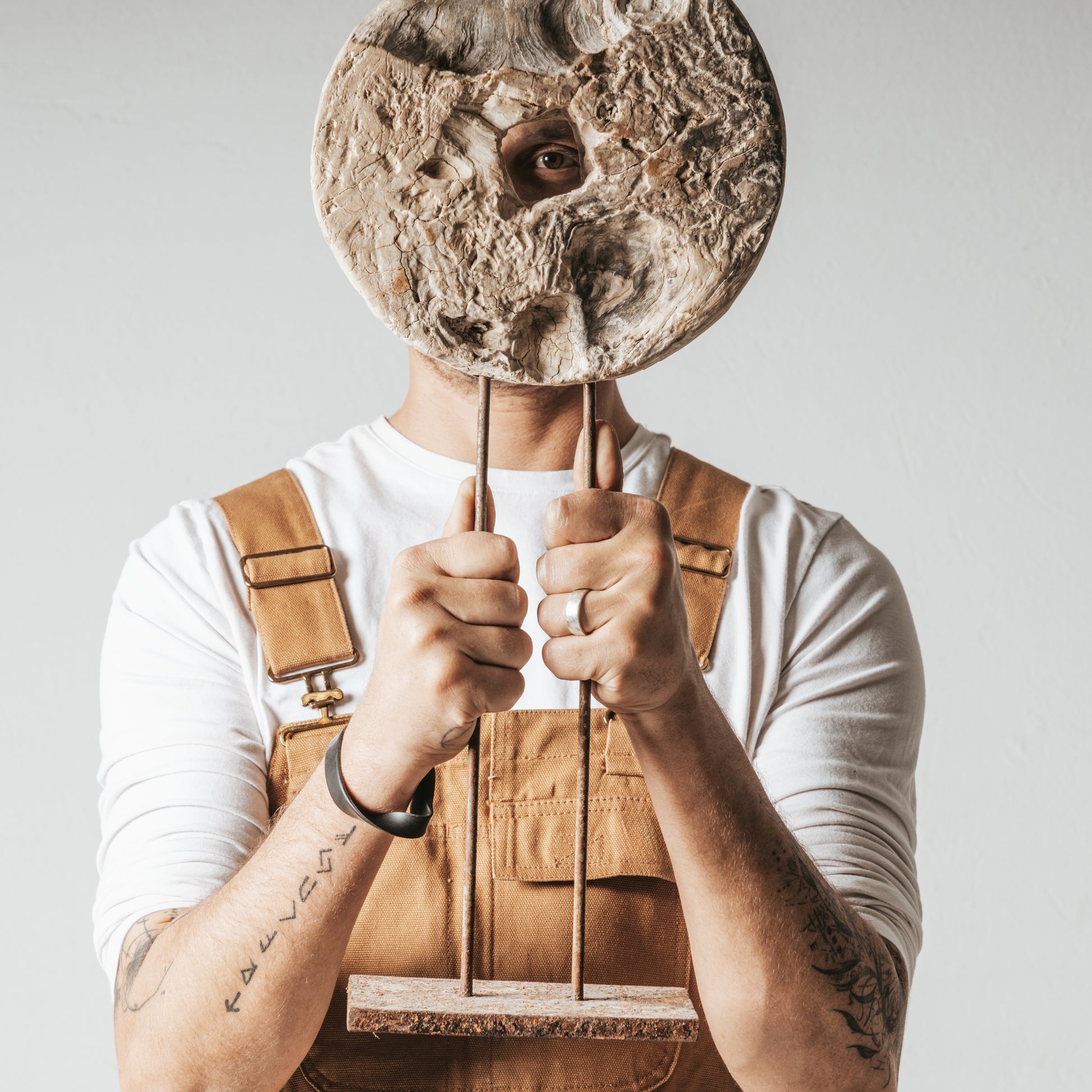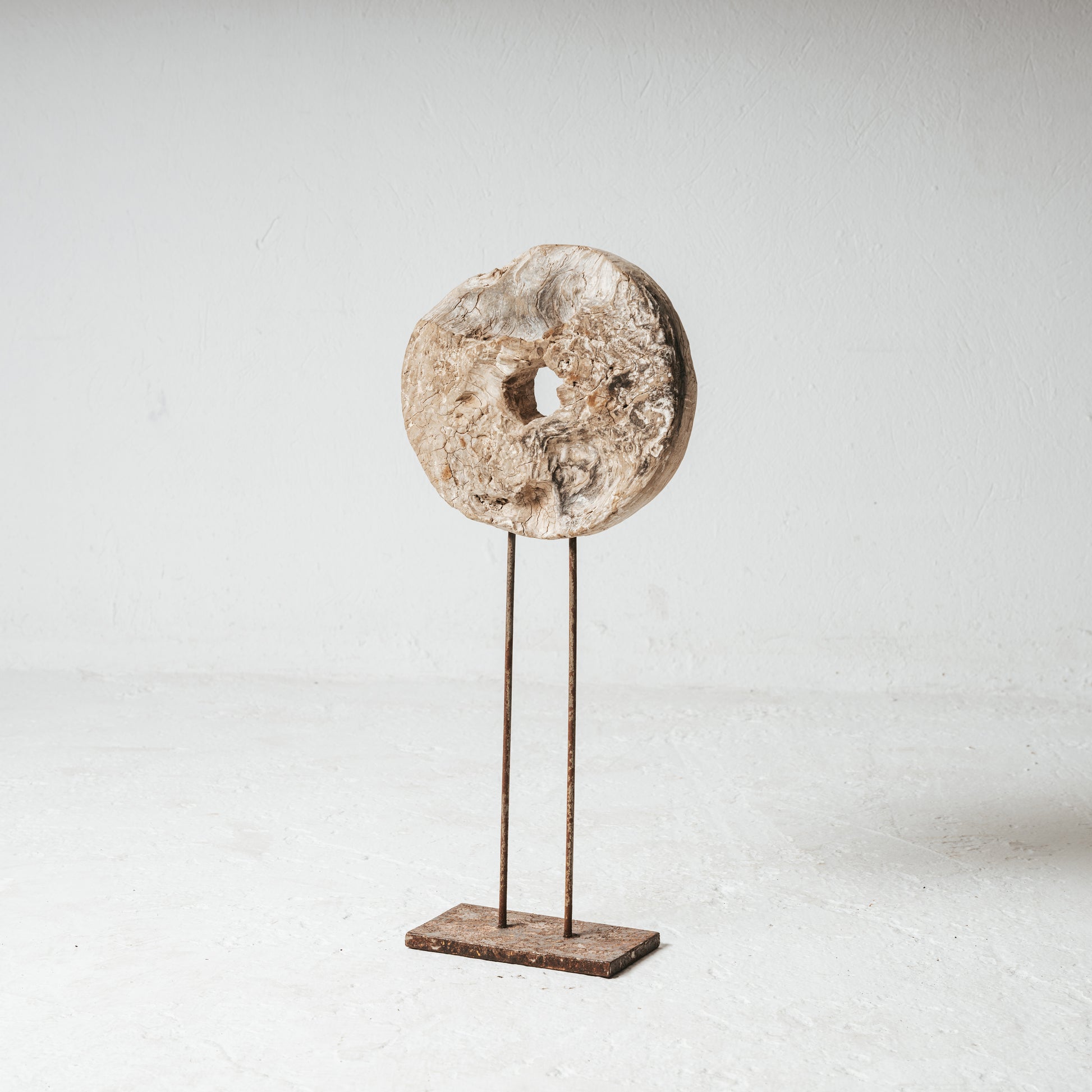 Ancien socle d’un tour de potier, façonné dans du bois d’olivier. Aujourd’hui érigé sur un socle en métal rouillé, ce cercle sculpté par le geste et l’usage devient une œuvre à part entière. Il incarne la mémoire d’un mouvement répété, désormais figé dans le silence.