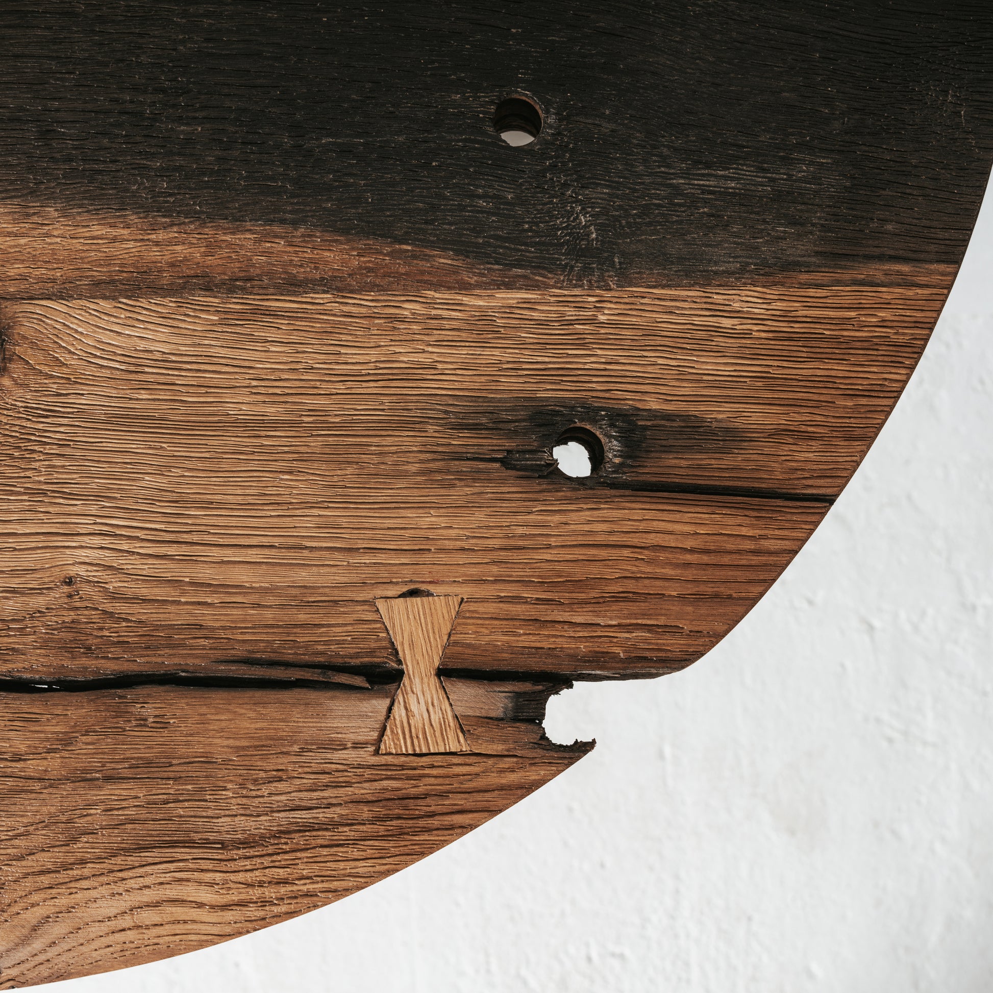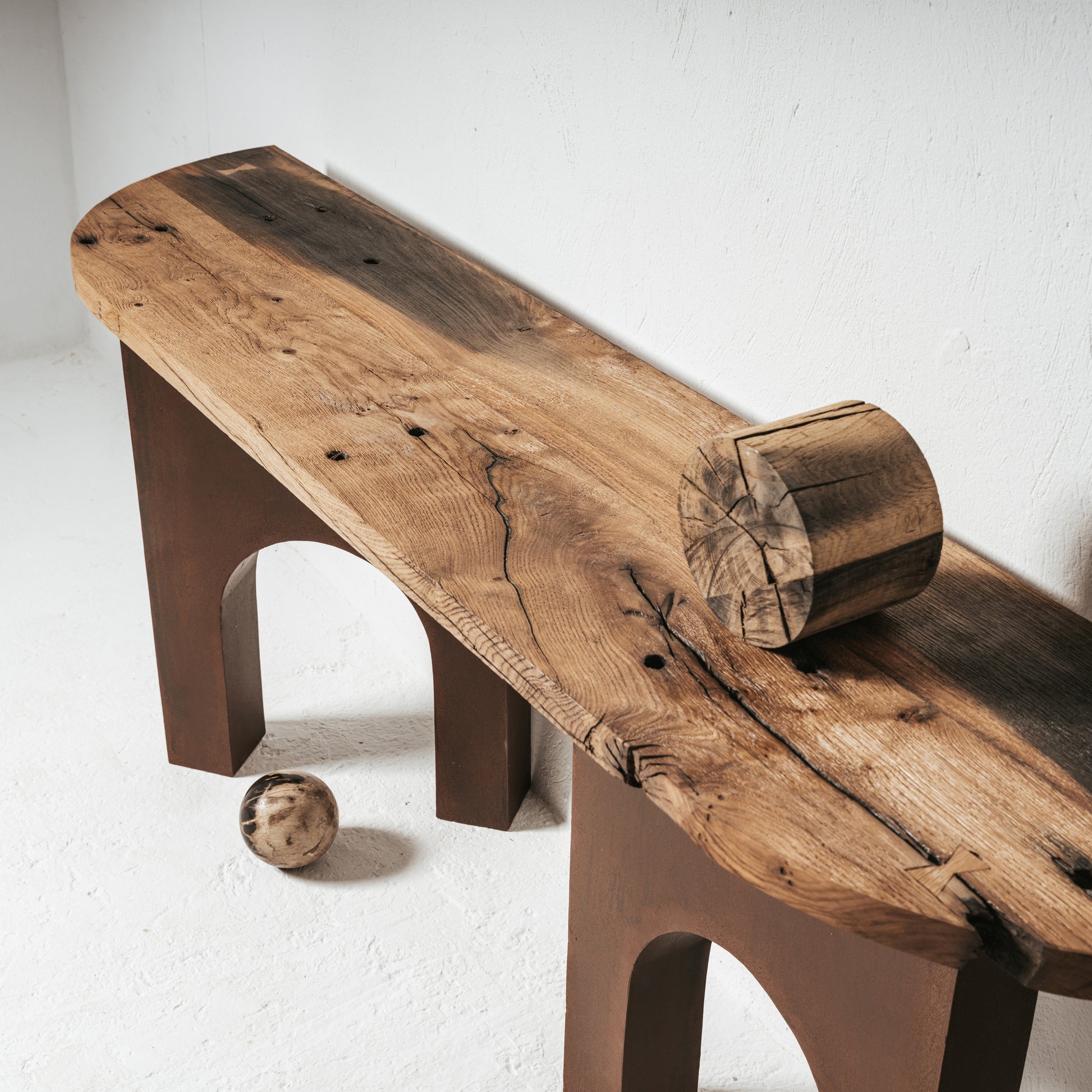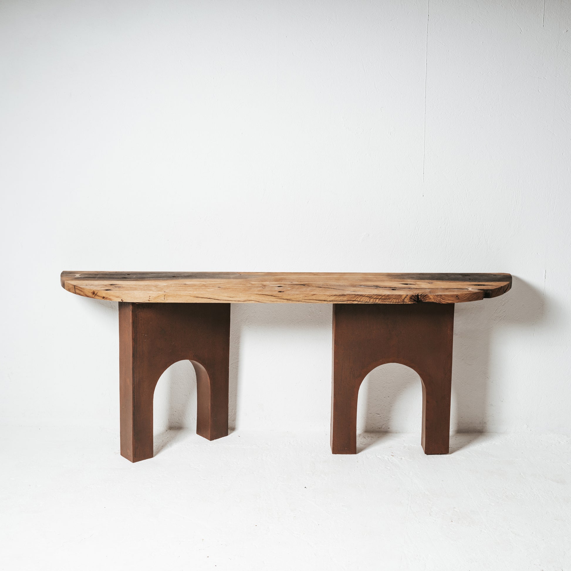 Cette console est composée d’un plateau en bois massif récupéré sur une ancienne traverse de chemin de fer, conservant ses irrégularités et sa patine naturelle. Le piètement est réalisé en tôle découpée, avec une forme en arche qui apporte stabilité et caractère. Chaque pièce est fabriquée en série limitée, avec une attention particulière portée à la matière et à ce qu’elle raconte.