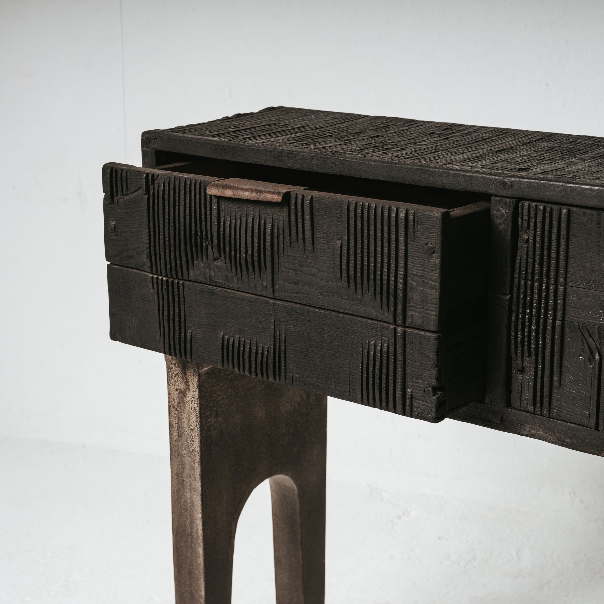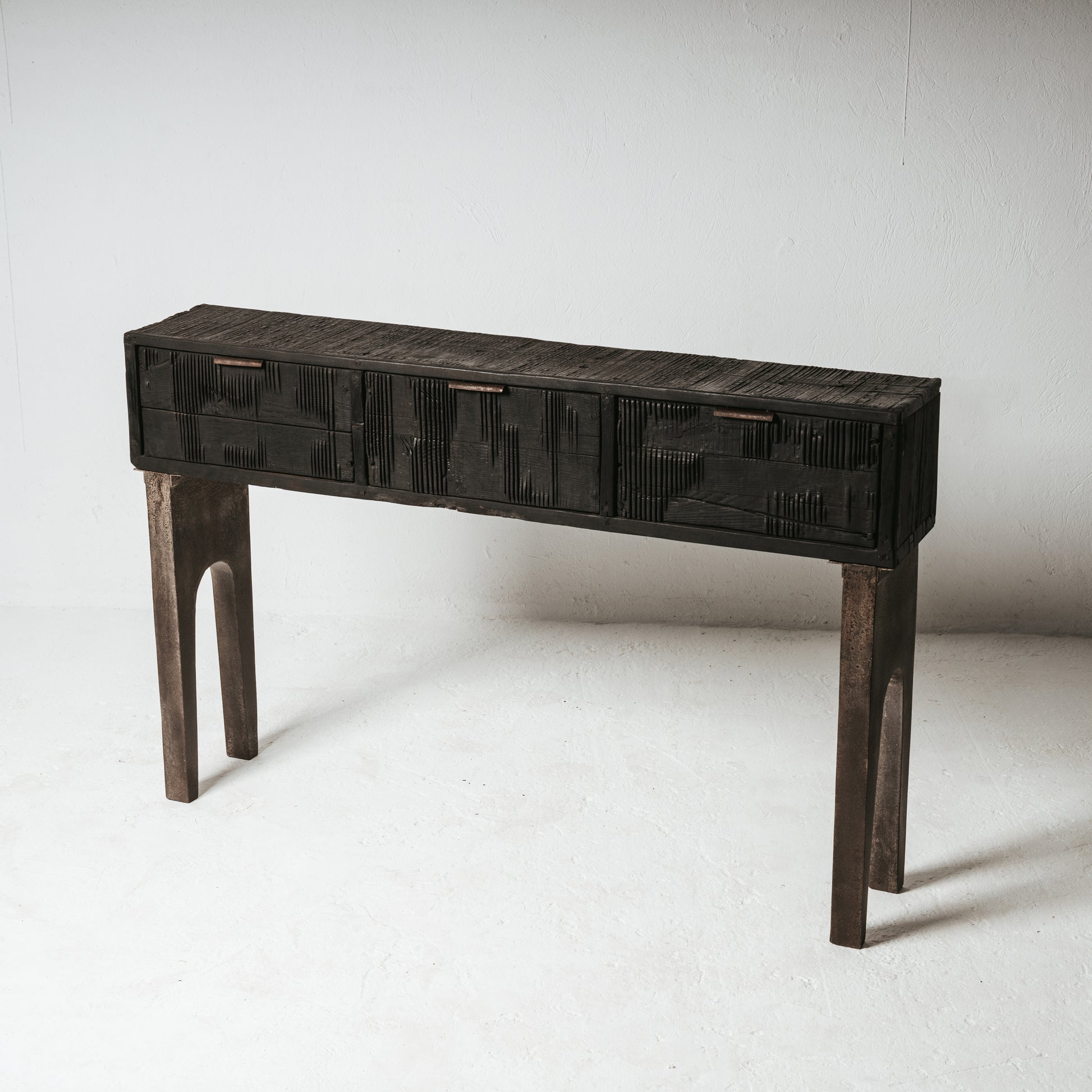 Console en bois brûlé, esthétique, chic et ethnique avec des techniques artisanales uniques comme le shou sugi ban (bois carbonisé).