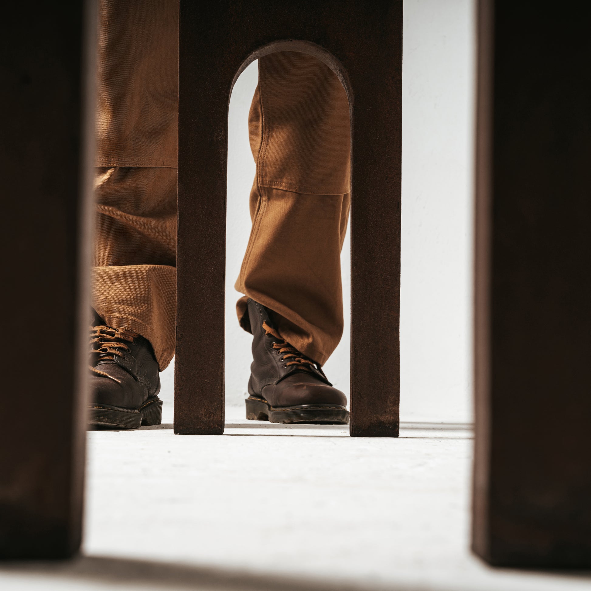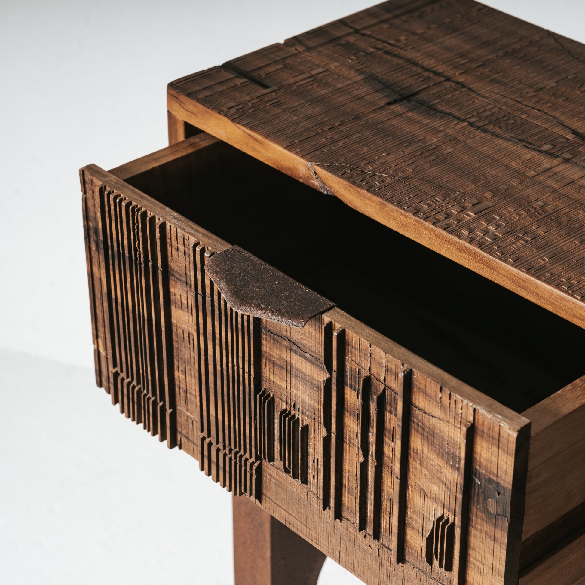 Le piètement, en acier rouillé, adopte une silhouette en voûte qui contraste avec la légèreté du plateau. Cette structure confère à la pièce une identité forte, oscillant entre robustesse industrielle et élégance artisanale. L’association du bois chaleureux et du métal patiné donne à cette console une présence intemporelle, à la croisée du design et de la sculpture.