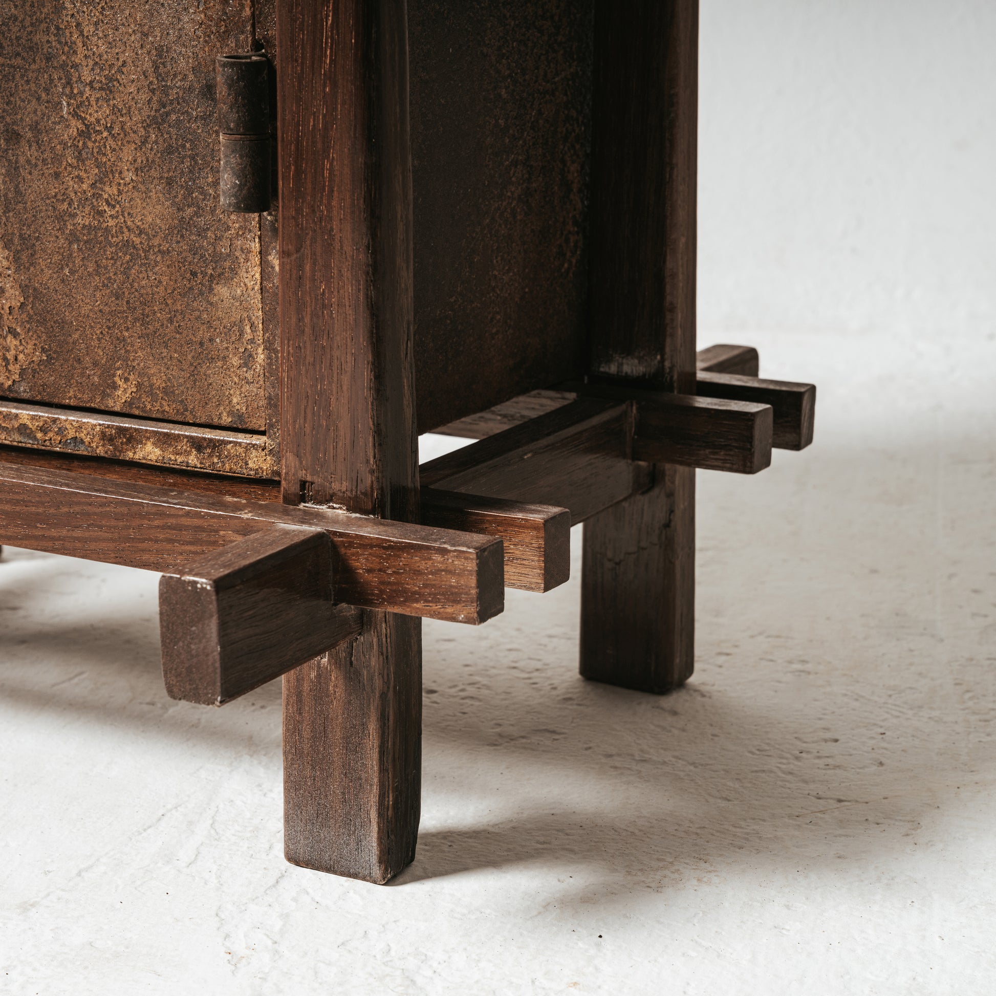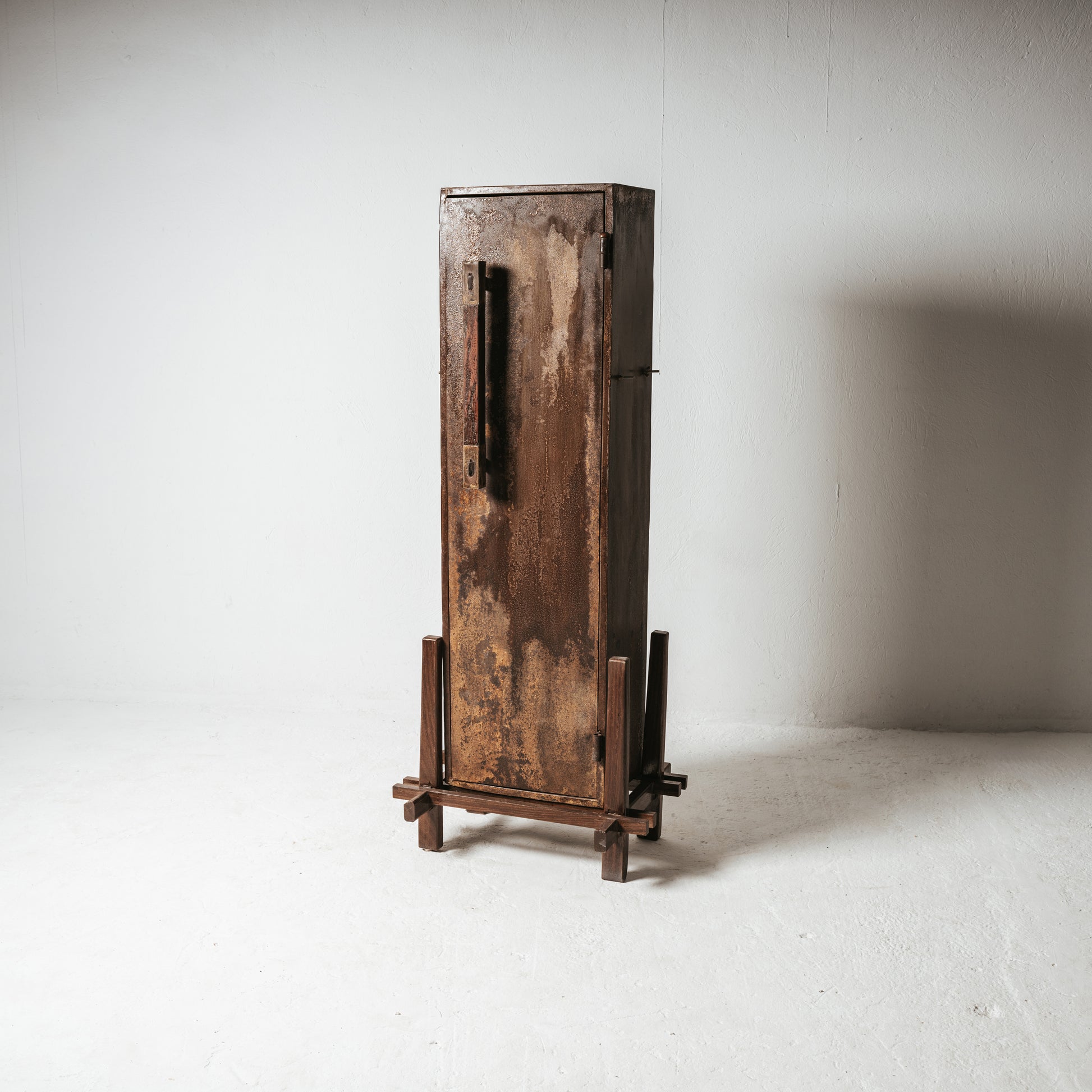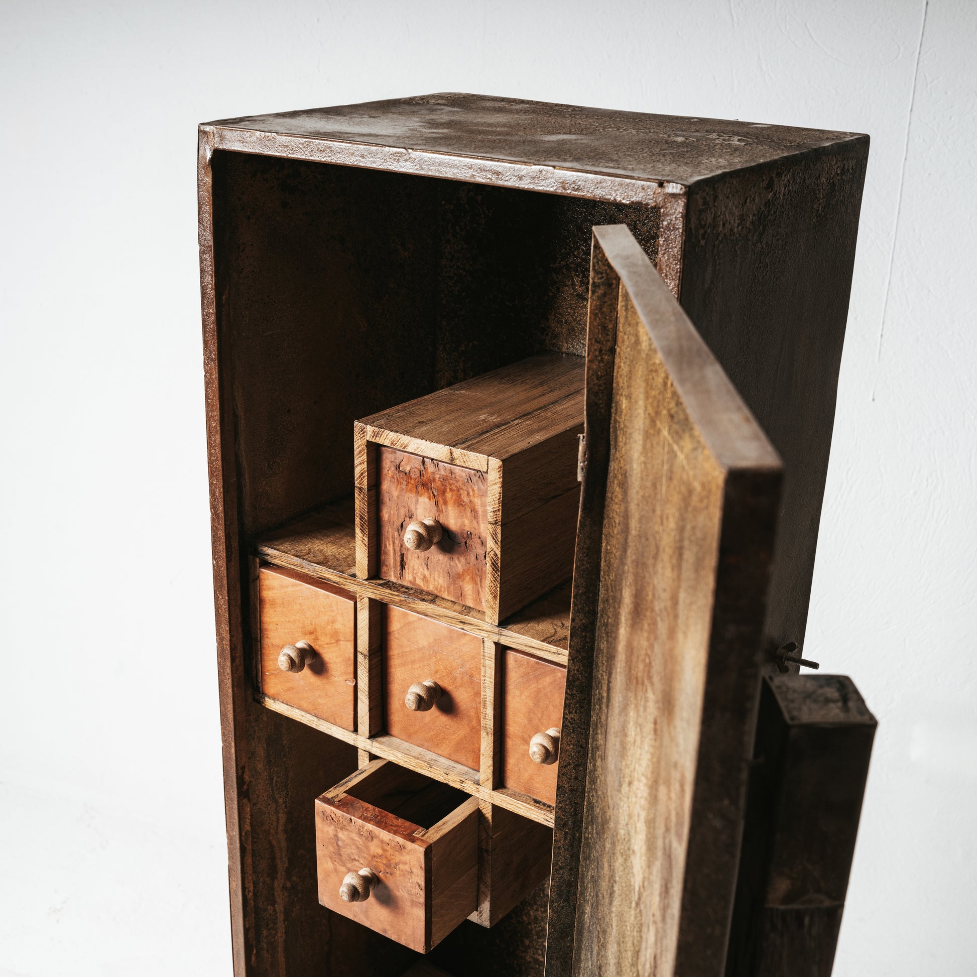 Cette armoire sculpturale associe un caisson en acier oxydé à des étagères en bois clair, et un module de rangement central composé de petits tiroirs formant une croix. Ce motif central, au-delà de sa fonction, évoque un symbole ancien de croisement, d’équilibre et de connexion entre les mondes — le vertical et l’horizontal, la matière et l’esprit.